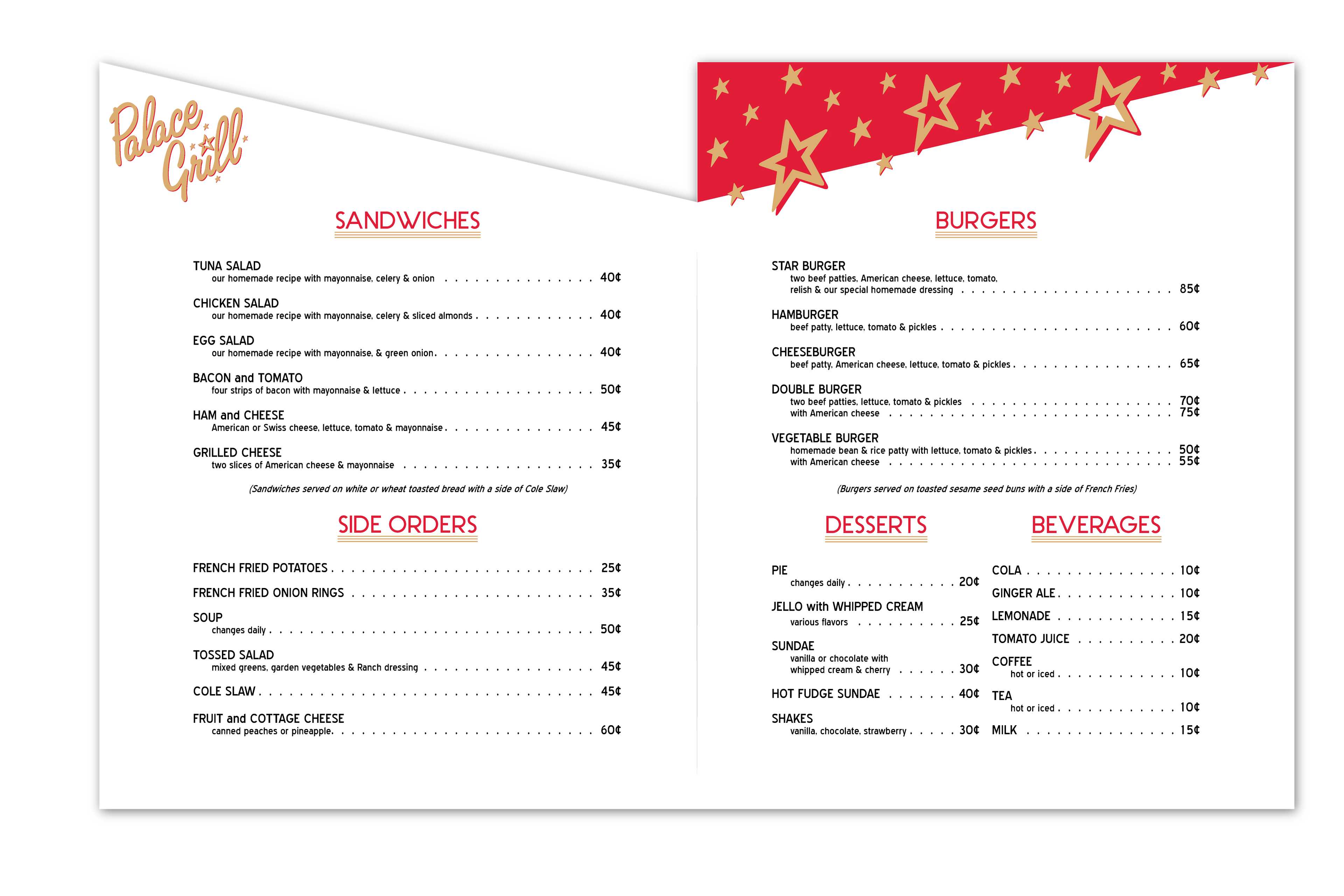 A 1950's diner themed menu created for the Palace Grill